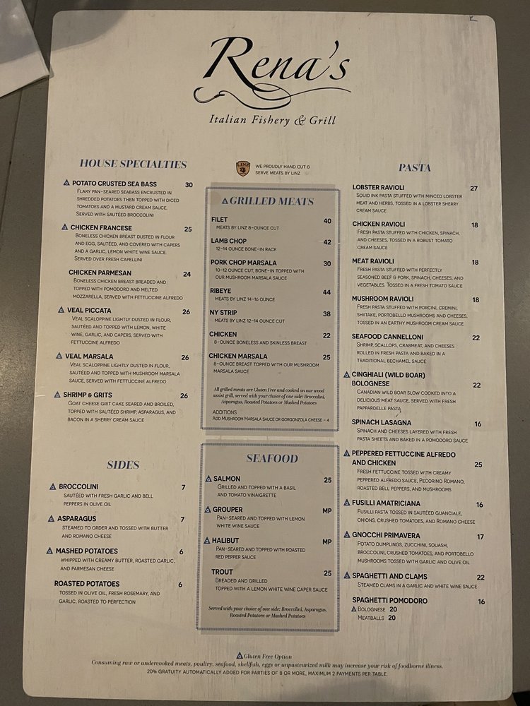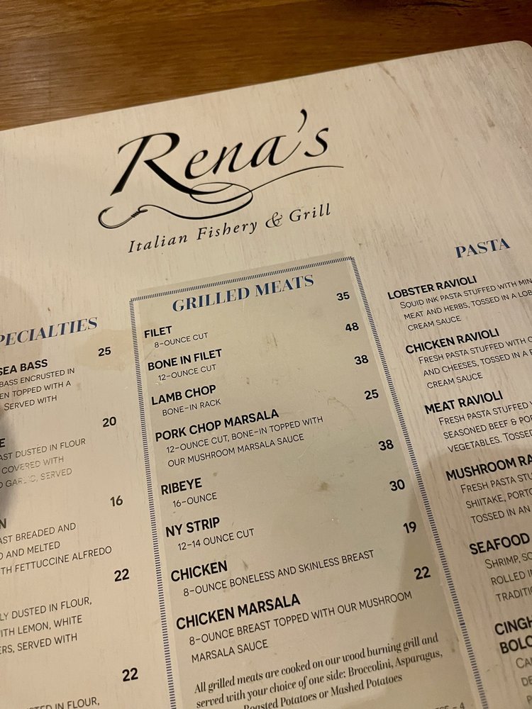 Introducing the menu at Rena’s Italian Fishery And Grill, located in Alpharetta, GA, you can expect a classy dining experience with a wide range of Italian seafood options. The restaurant offers vegan choices and is wheelchair accessible. Guests rave about the fresh and tasty dishes, with standout items like sea bass, trout, chicken Parmesan, and veal Marsala. The bread service is a must-try, and the service is consistently excellent. The ambiance is praised for being warm and inviting, making it a perfect spot for a delicious Italian meal. With options for outdoor seating, valet parking, and free Wi-Fi, Rena’s has all the amenities for a memorable dining experience. Next time you're craving Italian seafood, Rena’s should be at the top of your list.